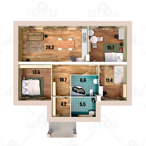 Общая площадь дома - 100 кв. м. В доме большая кухня-гостиная, три раздельные жилые комнаты, ванная и котельная.
