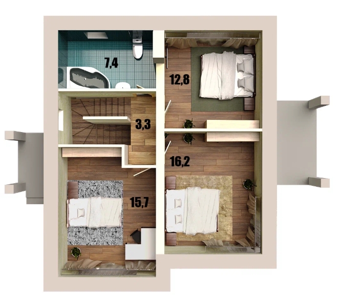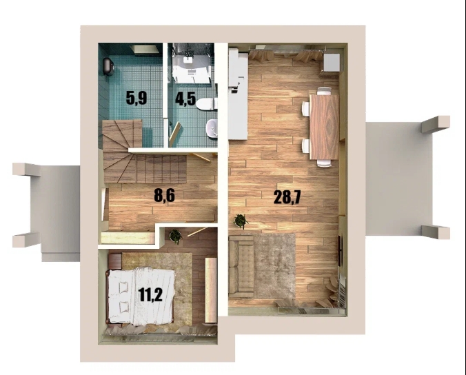 Общая площадь дома - 115 кв. м. На первом этаже просторная кухня-гостиная, гостевая комната, санузел и котельная. На втором этаже три раздельные спальные комнаты и ванная.