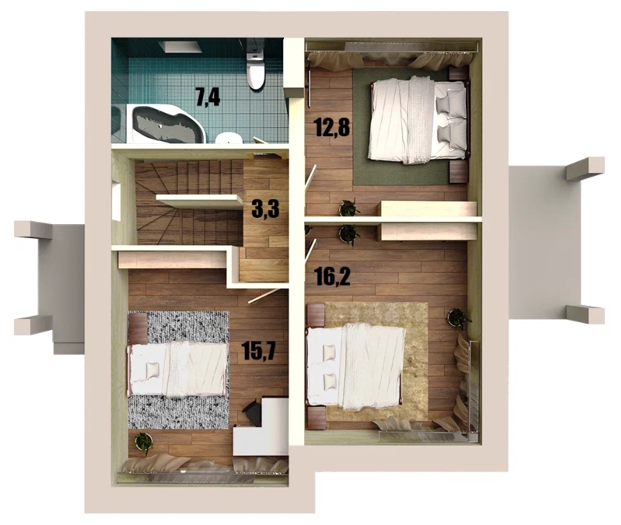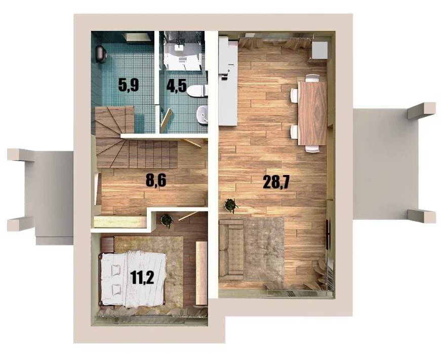 Общая площадь дома - 115 кв. м. На первом этаже просторная кухня-гостиная, гостевая комната, санузел и котельная. На втором этаже три раздельные спальные комнаты и ванная.
