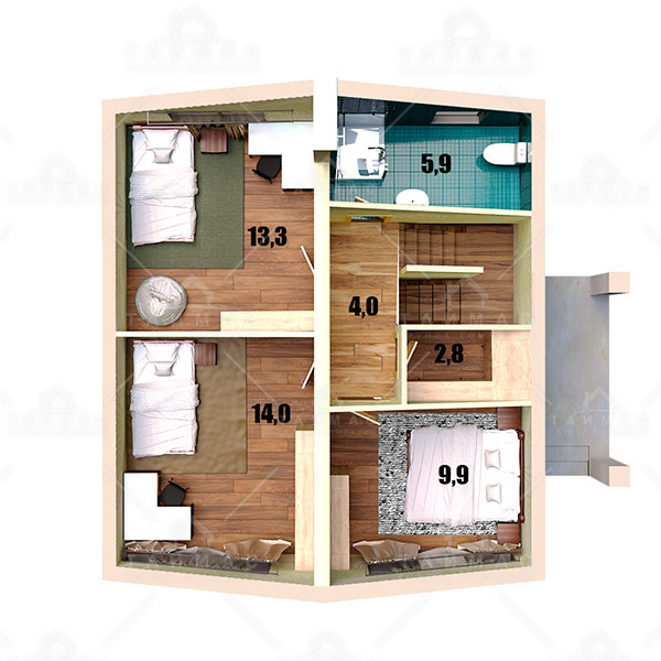 Общая площадь дома - 120 кв. м. На первом этаже просторная кухня-гостиная, гостевая комната, санузел и котельная. На втором этаже три раздельные спальные комнаты, гардеробная и ванная.